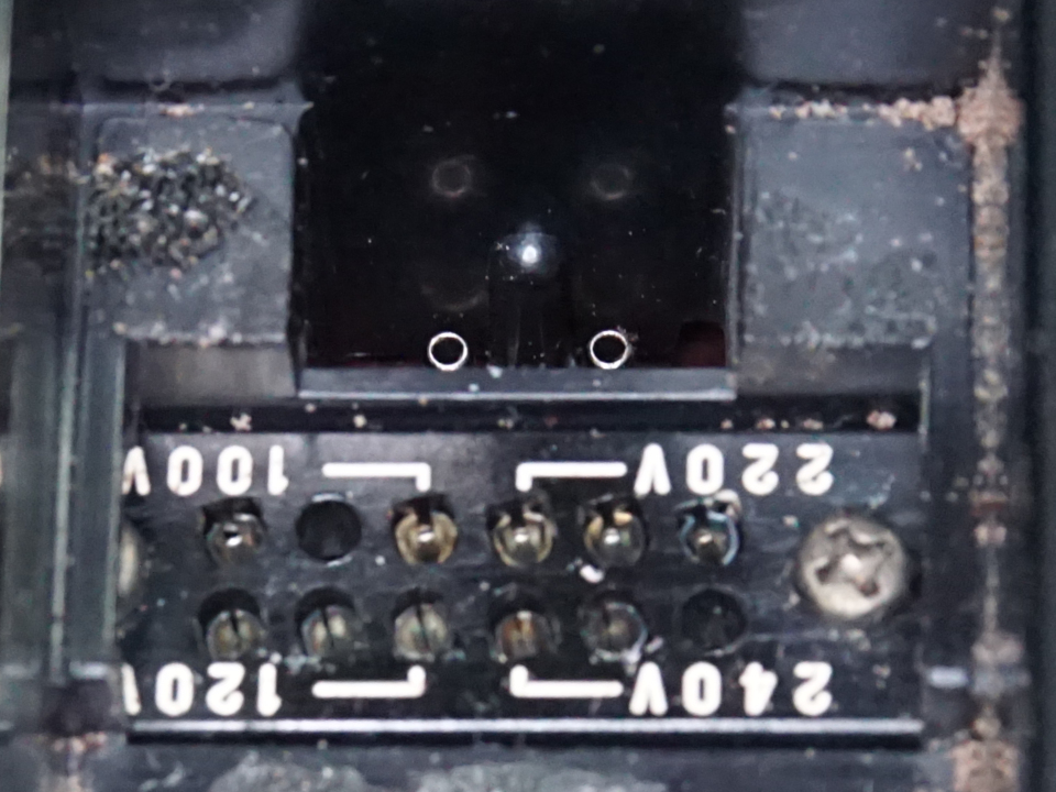 矢印を目的の電圧に合わせて差し込みます。おそらく電源トランスの2次側タップを切り替えているのではないかと思います。半刺しだとピンに触れそうなので1次側ということは無いと思うのですが……