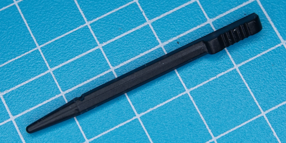操作用のスタイラス、感圧式なのでただのプラスチックの棒です。タッチパネルのキャリブレーション以外は指でも特に困らないと思います。